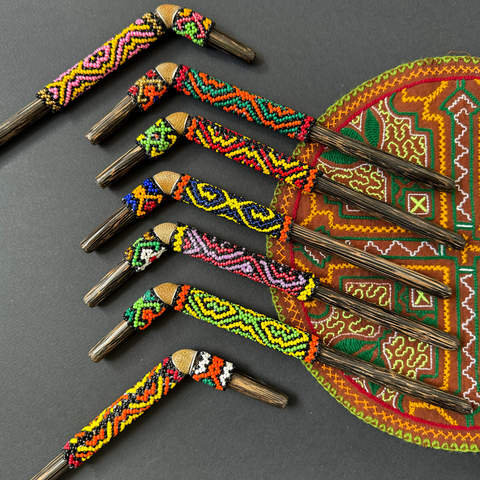 Трубочка изготовлена из черного дерева и украшена бисерным плетением.