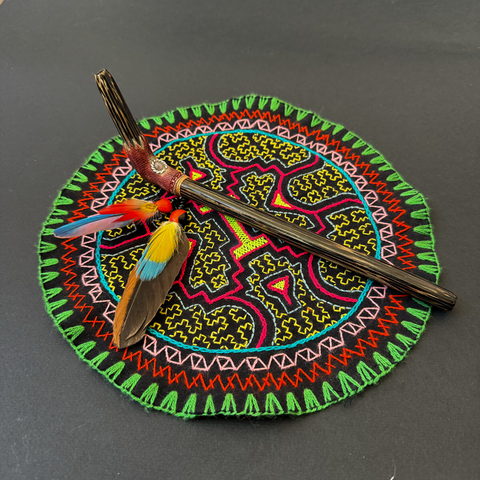 Трубочка изготовлена из черного дерева и украшена яркими перьями.