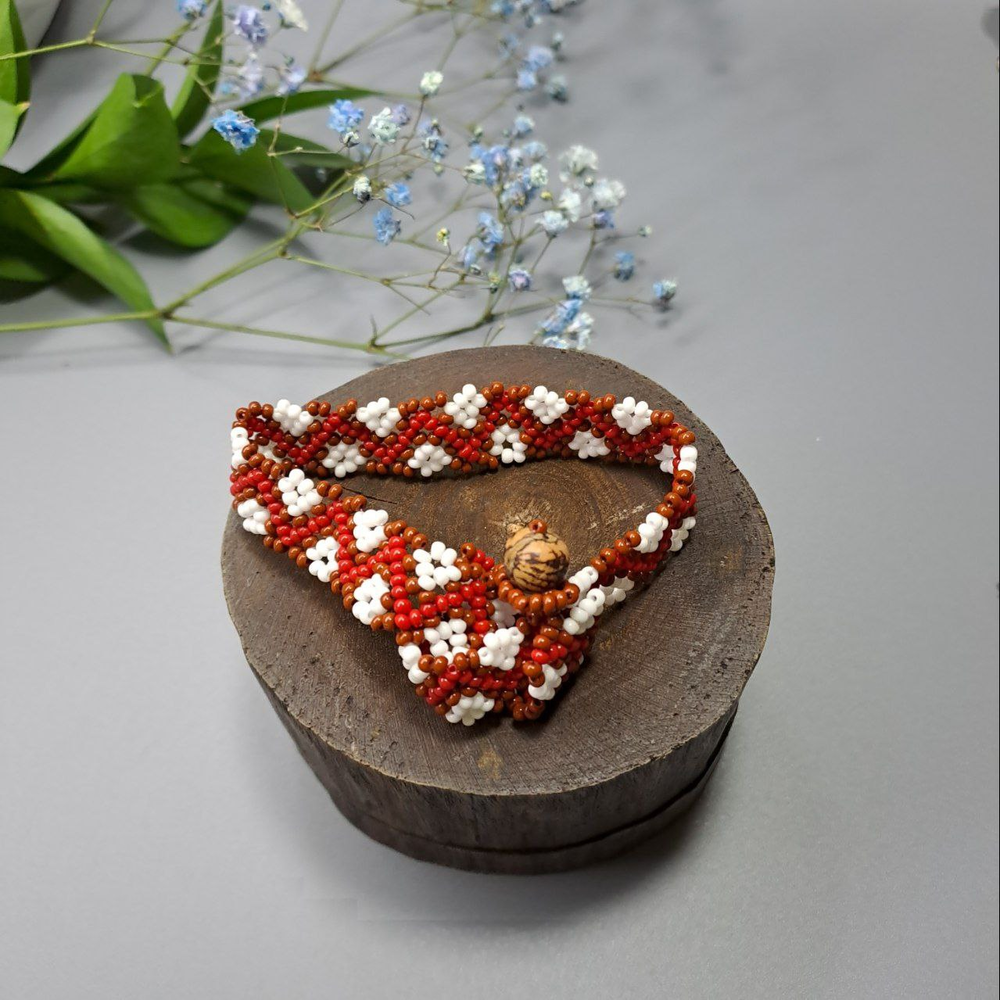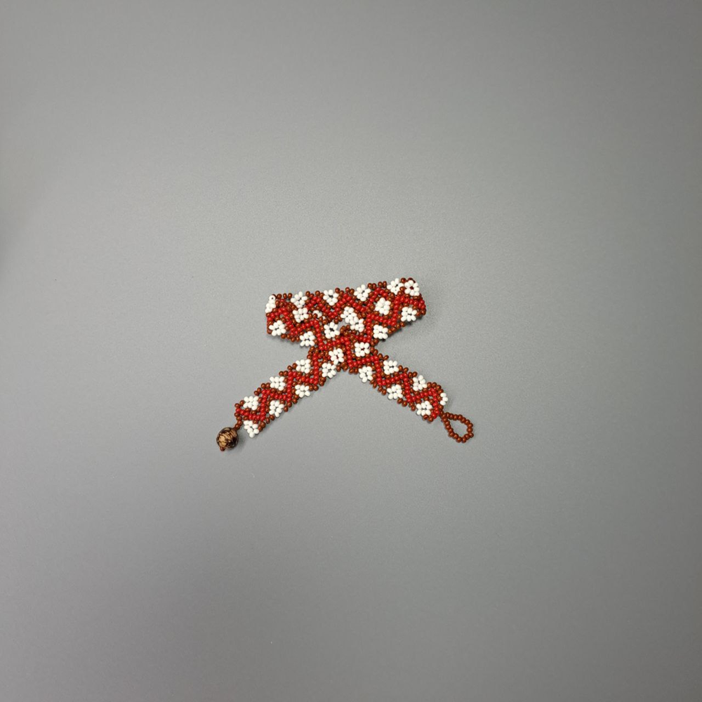 Узор на этом браслете — красный зигзаг на белом фоне — один из традиционных мотивов племени, символизирующий поток энергии, движение жизни и защиту. Красный — цвет силы, крови и связи с родом. Белый — цвет ясности, намерения и света.